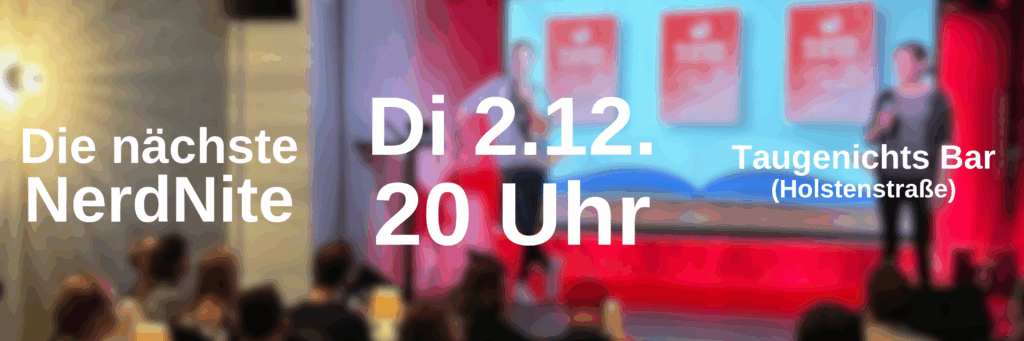 Verpasse keine NerdNite mehr! Wir informieren dich per E-Mail, wenn es neue NerdNite-Termine gibt (hier registrieren).